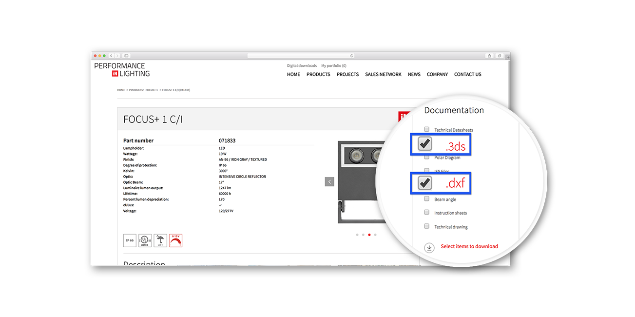 PERFORMANCE iN LIGHTING offers fixtures in the following formats, .3ds and .dxf, two of the most widely used 3d formats in the world.