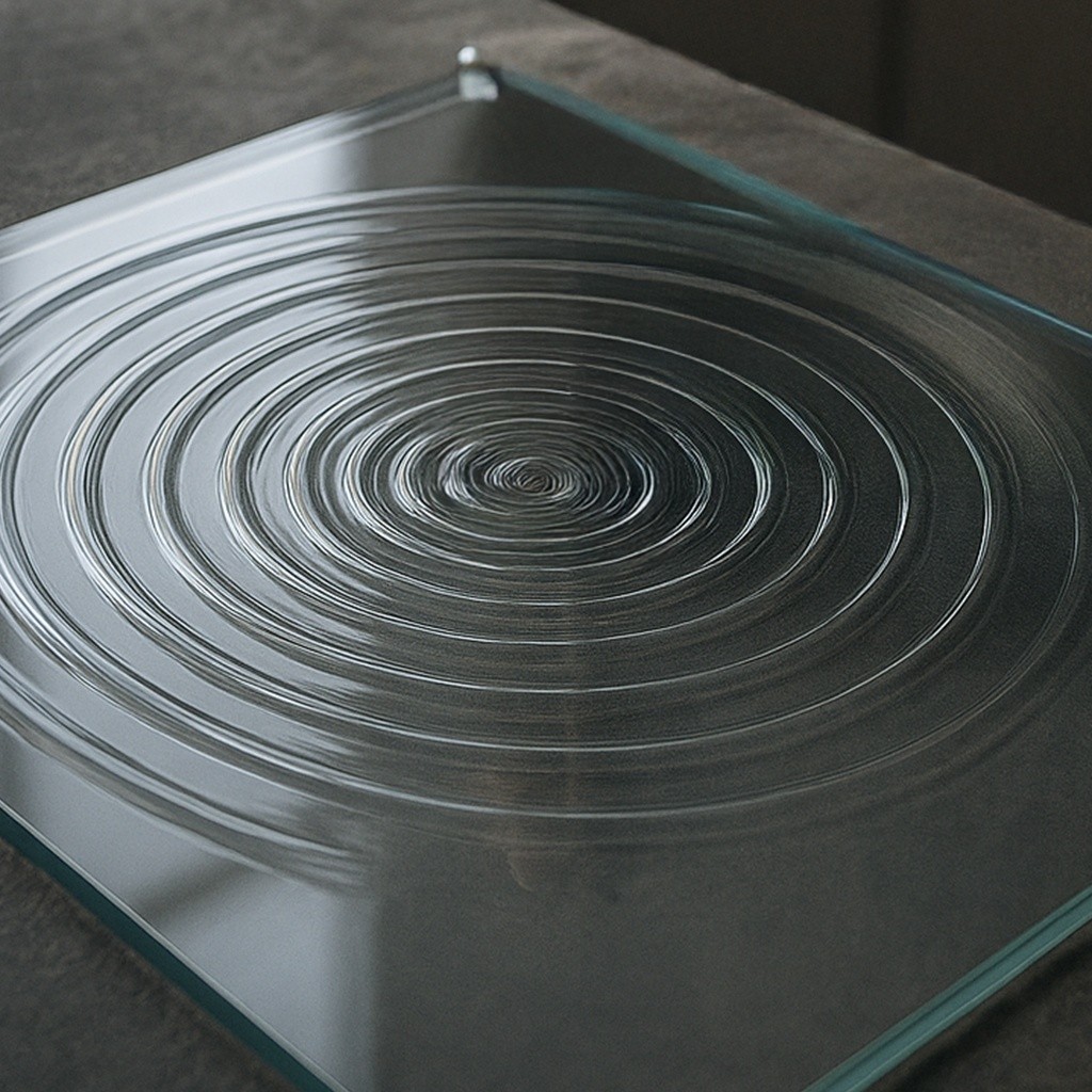 A tribute to glass craftsmanship: a surface shaped to capture the instant when a drop meets a still pool of water.