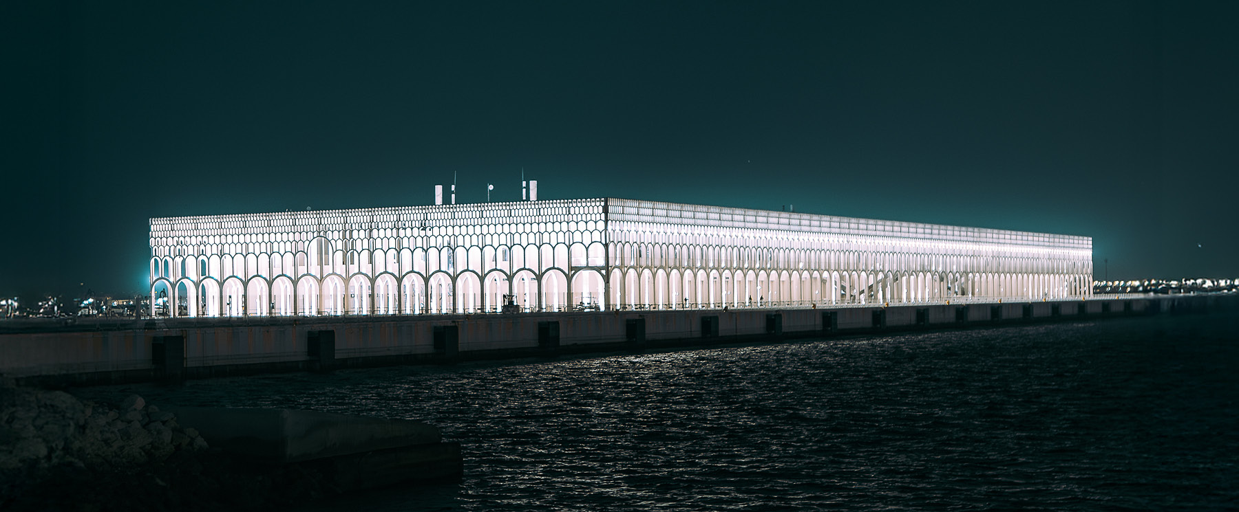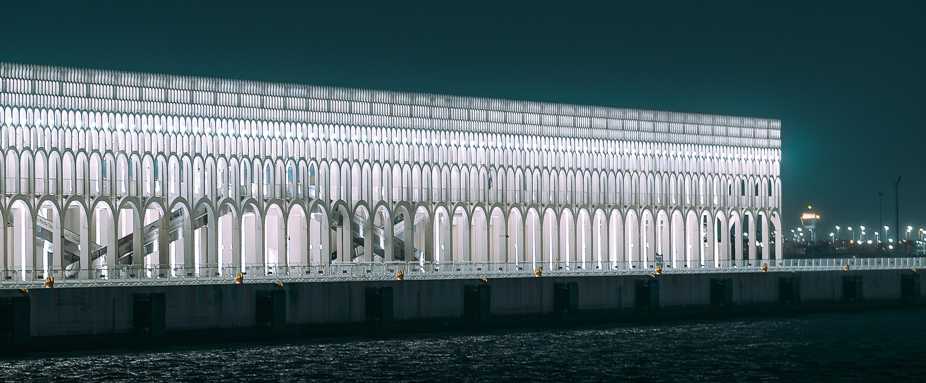 The lighting design enhances the architecture, transforming the Terminal into a landmark that dominates the nighttime panorama of Doha’s port. Uniform illumination of the perimeter galleries creates a striking interior backdrop, where the seven tiers of diminishing arches (1,154 in total), viewed from outside, become a refined decorative filigree that defines the entire complex.