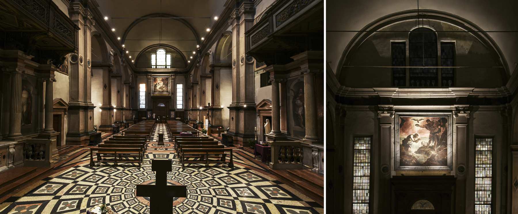 Seguendo il concept illumintecnico originale a partire dal fondo del presbiterio il “Martirio di San Giorgio” di Paolo Veronese diventa il punto focale e crea un percorso di luce che guida il visitatore a scoprire la totalità delle opere.